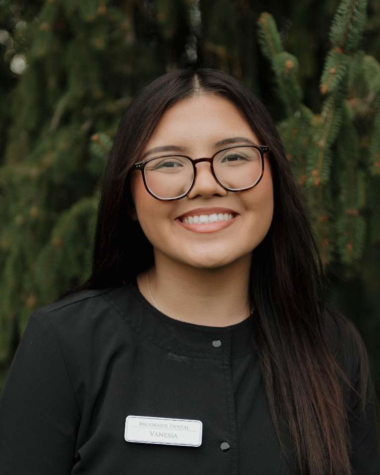 Vanessa has been with Brookside Dental since May 2025, and she previously worked as a dental assistant for 2 years. She loves helping her patients gain confidence and getting to know them personally, making them feel comfortable and proud of their smiles. A fun fact about her is that she loves the color pink, rain, and dinosaurs, highlighting her playful and unique personality. Outside of work, she enjoys hiking, snowboarding, and all kinds of fall-time activities, especially those that allow her to enjoy the beauty of nature. What always brings her a smile are sunsets, the outdoors, and the cozy vibes of autumn. One word to describe her is ambition-driven, reflecting her persistent, goal-oriented, and highly motivated personality.
